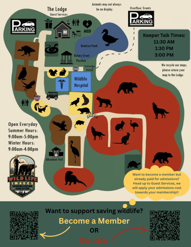Wildlife Images is a working wildlife rehabilitation center with a number of permanent residents who can’t be released. It is open for visitation year round. Join us for an up close and personal experience with some of our resident animals including wolves, grizzly bears, bobcats, birds of prey and many more. We guarantee your visit will be an unforgettable experience!